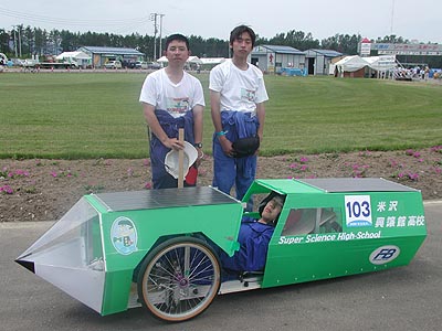 3年生3人が効率の良い電気自動車の研究と開発に励んできました。最後の大会となる今回は、今まで蓄積してきた知識と技術をフルに発揮して3周走破を目指します。